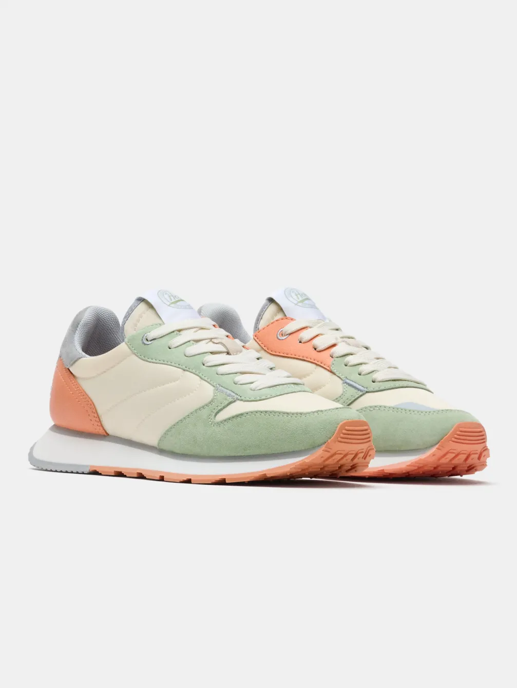 Voor Liefhebbers Van Retro- En Vintage-Stijlen Is De Kyrene In Crèmekleurig Nylon Met Asymmetrische Details In Groen Suède En Zalmleer De Perfecte Mix Om Overal Een Uniek Statement Te Maken. De Met Wafel Ontworpen Zool In De Kleuren Groen, Oranje En Grijs, In Combinatie Met Het Reliëflogo En Het Grijze Rubberen Detail, Is De Kers Op De Taart. Hun Lichtgewicht Gevoel En Comfort Zijn Gegarandeerd Dankzij De Binnenzool Van Traagschuim. Perfect Om Te Combineren Met Klassieke Jeans En Je Favoriete T-Shirt Om Een Nieuwe Stad Met Veel Stijl Te Verkennen.