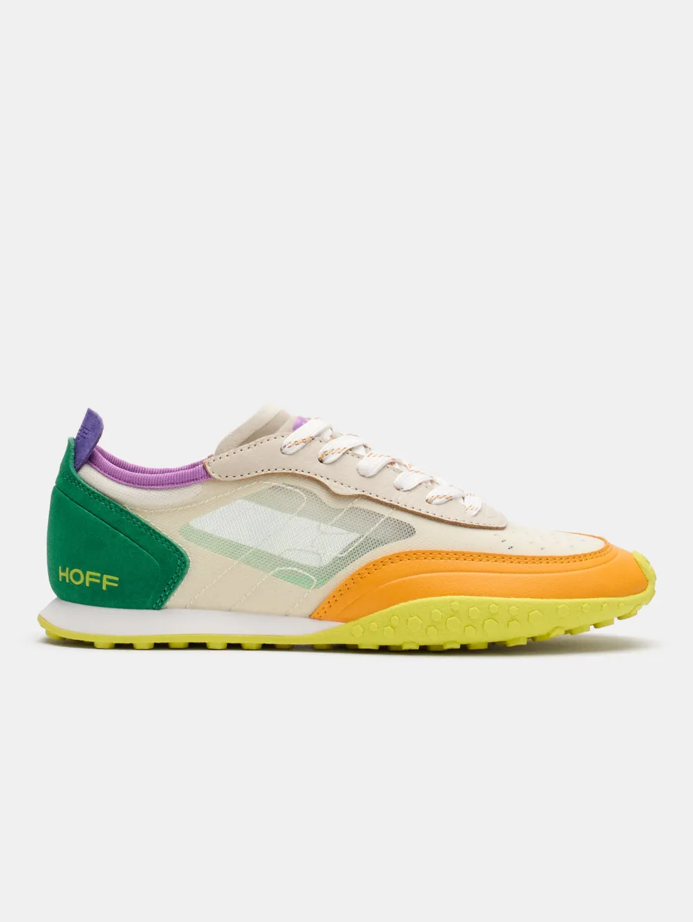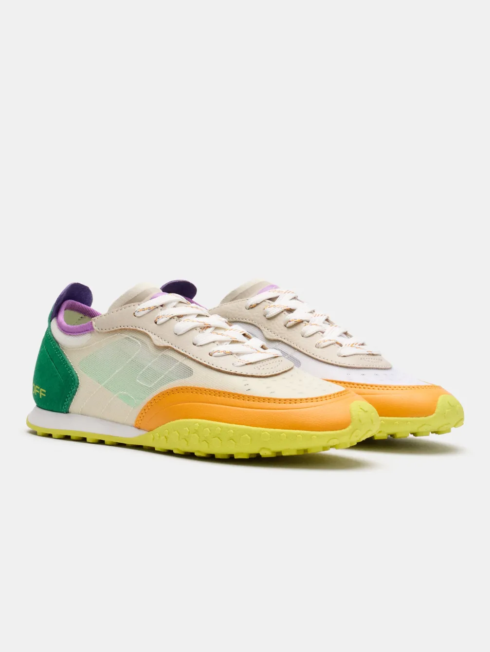 Lichtheid En Frisheid In Één Enkele Sneaker. De Bird Robin Biedt Een Ontwerp Dat Net Zo Uniek Is Als Ideaal Voor Zomerdagen, Waar Comfort En Stijl Uw Eerste Prioriteit Is. Transparant Gaas Aan De Zijkanten, Mosterdleer En De Gele Rubberen Zool Met Studs Zijn Niet Alleen Een Knipoog Naar Voetbalsneakers, Maar Zorgen Er, In Combinatie Met De Flexibele Tong En Structuur, Ook Voor Dat Je Je Favoriete Steden Wilt Verkennen Zonder Moe Te Worden. Het Contrast Met Groen En Lila Geeft Ze Een Ongeëvenaard Tintje Aan Je Uiterlijk. Combineer Ze Met Een Spijkerrok Of Een Oversized Broek.