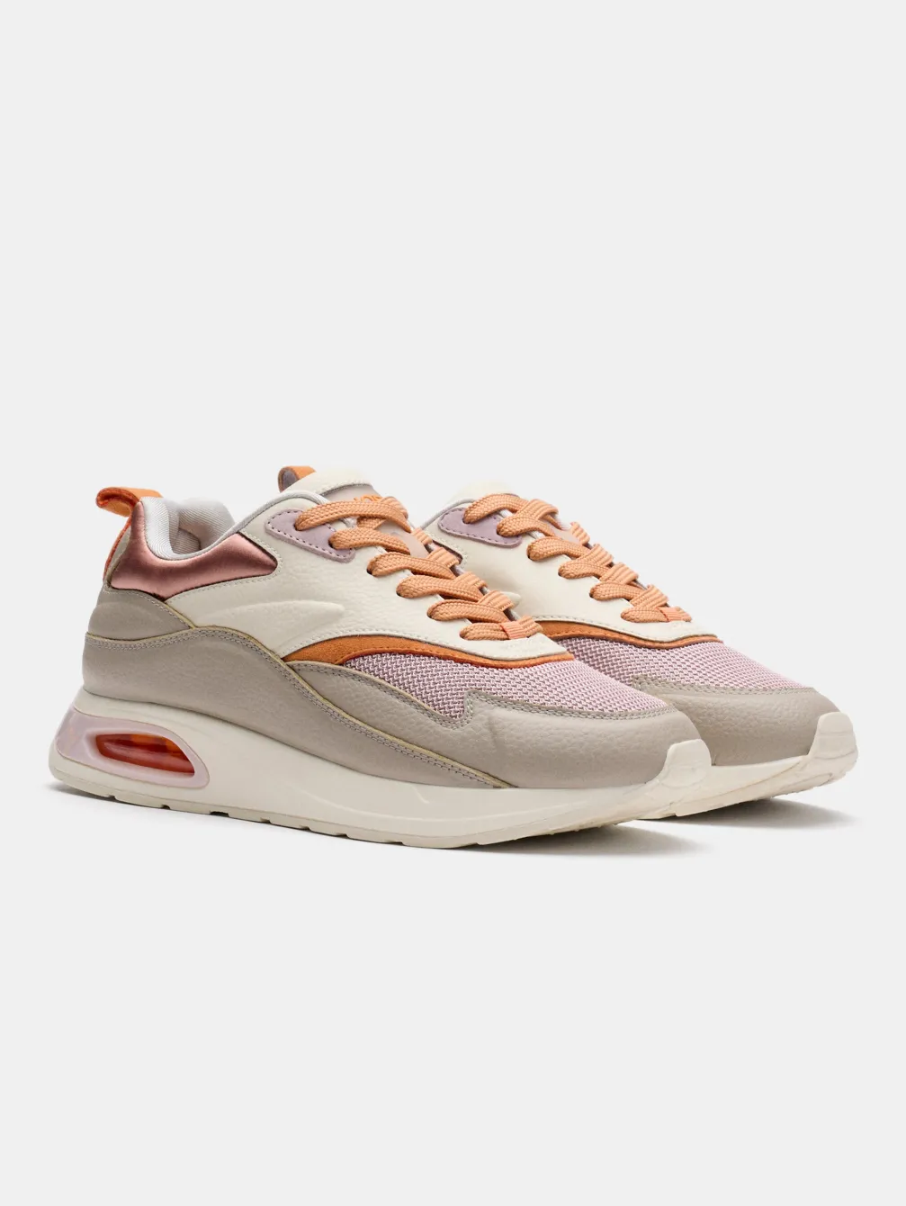 Het Iconische Silhouet Van De Jaren 90 Keert Terug Met The Great Wall, Hardloopschoenen Die Uniek Zijn Vanwege Hun Kleuren En Materialen. Het Combineert Leer Met Kleine Details In Suède En Stof In Crème, Grijze, Roze En Pasteloranje Tinten, Contrasterend Met Satijnen Stof In Lichtroze Aan De Bovenkant. De Oranje Veters En Het Opvallende Hoff-Logo Geven Het Een Uniek Tintje. Essentieel Voor Elke Garderobe, Het Combineert Stijl En Comfort Dankzij De Binnenzool Van Traagschuim En De Luchtkamer In Een Roze Tint Die Contrasteert Met De Oranje Binnenkant.