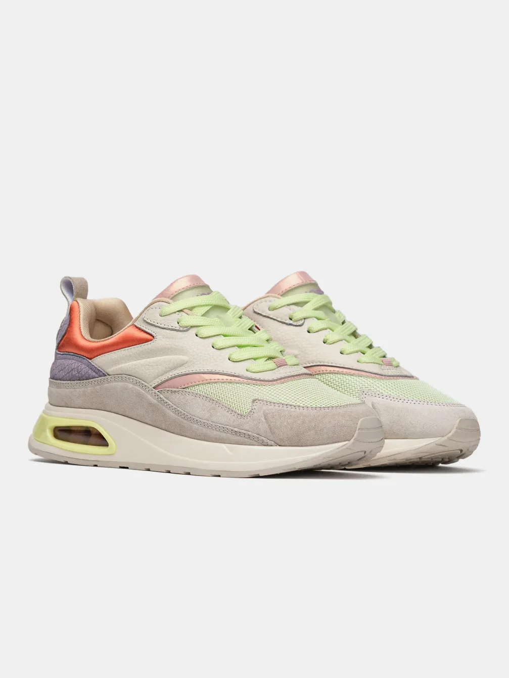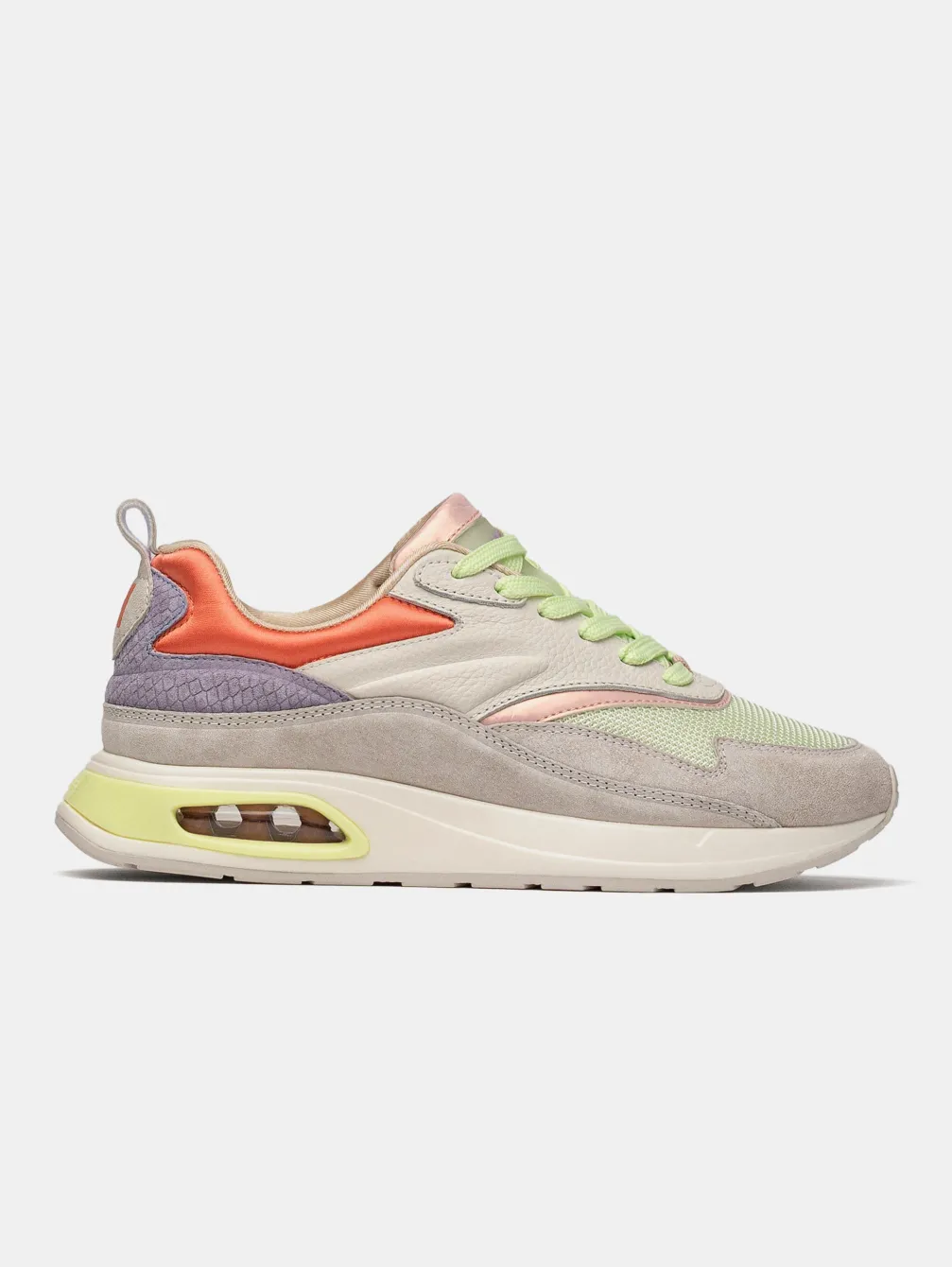 Met Een Iconisch Silhouet Uit De Jaren 90 Zijn De Sacre Coeur Unieke Hardloopschoenen Vanwege Hun Scala Aan Kleuren En Materiaalcombinaties. Details In Grijs En Lichtblauw Leer En Suède Contrasteren Met Een Satijnen Stof In Koraaltint Aan De Bovenkant. De Limoengroene Veters En De Verhoogde Lila Slangenprint H Van Hoff Voegen Accenten Toe Die Deze Sneakers Tot Een Maatstaf Maken. Een Garderobe-Essential Met Essentiële Stijl, Ondersteund Door Het Comfort Van De Binnenzool Van Traagschuim En De Luchtkamer In Een Pastelgroene Tint.